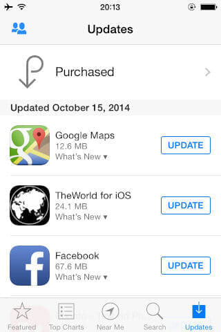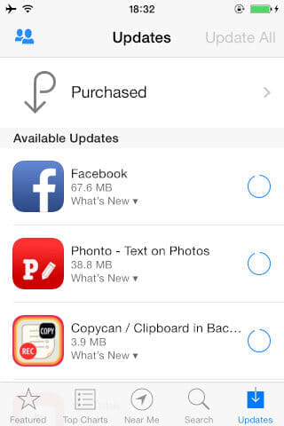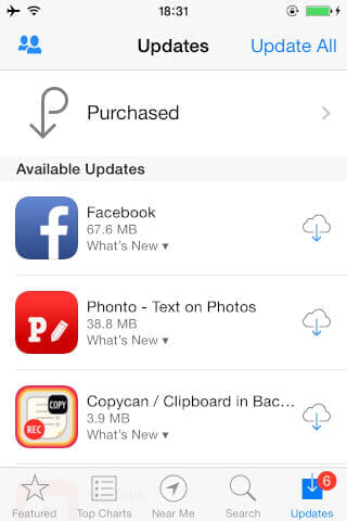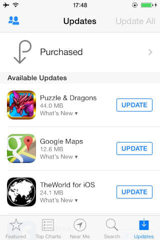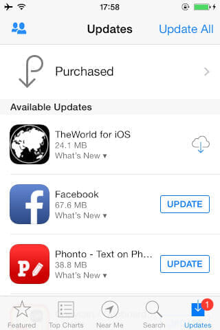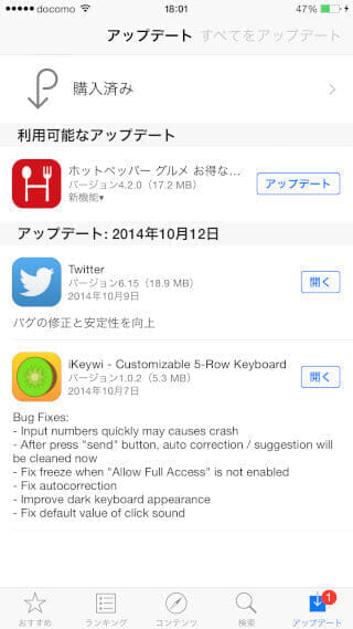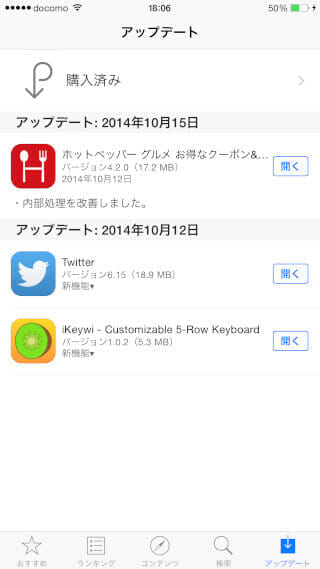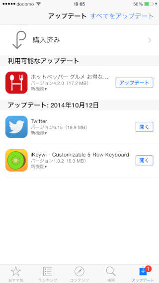 その場合、一つ一つ個別のページに行ってアップデートするか、「設定」→「iTunes & App Store」→「自動ダウンロード」の「アップデート」をONにするという方法で回避出来ます。