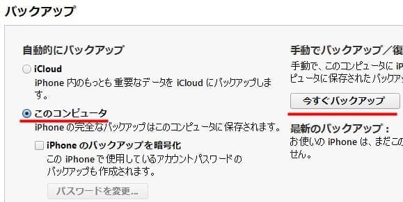 デバイスをPCに接続して、iTunesを起動→バックアップの項目を「このコンピュータ」にして「今すぐバックアップ」