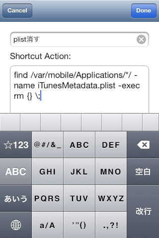 これで、ユーザー・アプリケーション(/var/mobile/Applications)内の「iTunesMetadata.plist」が全部消えます。