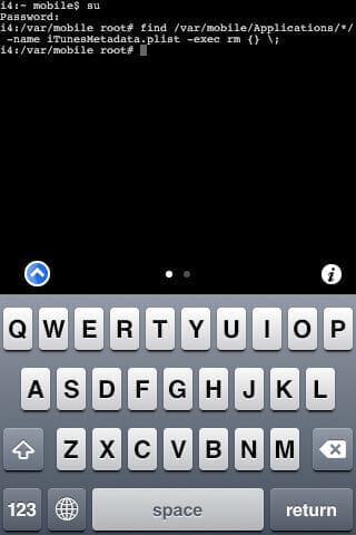 find /var/mobile/Applications/*/ -name iTunesMetadata.plist -exec rm {} \;