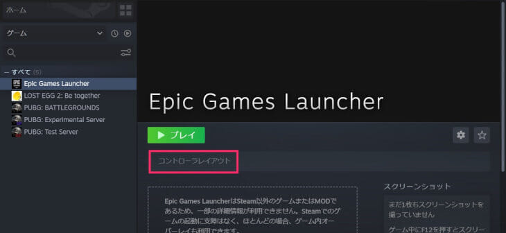 Steamのライブラリから追加した「Epic Games Launcher」→「コントローラレイアウト」をクリック