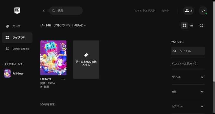 キーボードとマウスやPS4やPS5、XBoxコントローラーなど対応しているコントローラーでプレイする場合は「ライブラリ」から『フォールガイズ』(Fall Guys)を選択することでプレイできます。