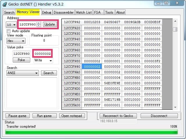 「Search」機能と過去のデータを考慮して指定アドレスを12Cから12Dくらいまでに設定、結果からそれらしいものを「Poke」して当たっているか探っていくといった形になります。