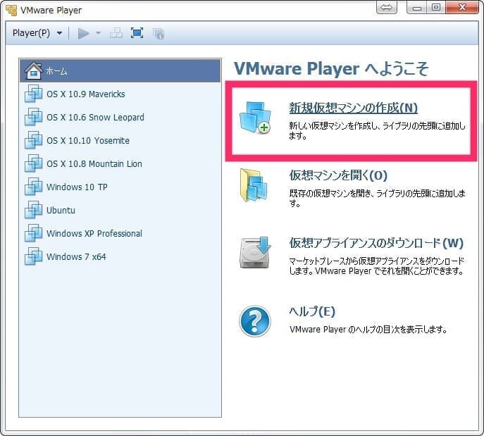 1)VMwareを立ち上げて「新規仮想マシンの作成」をクリック