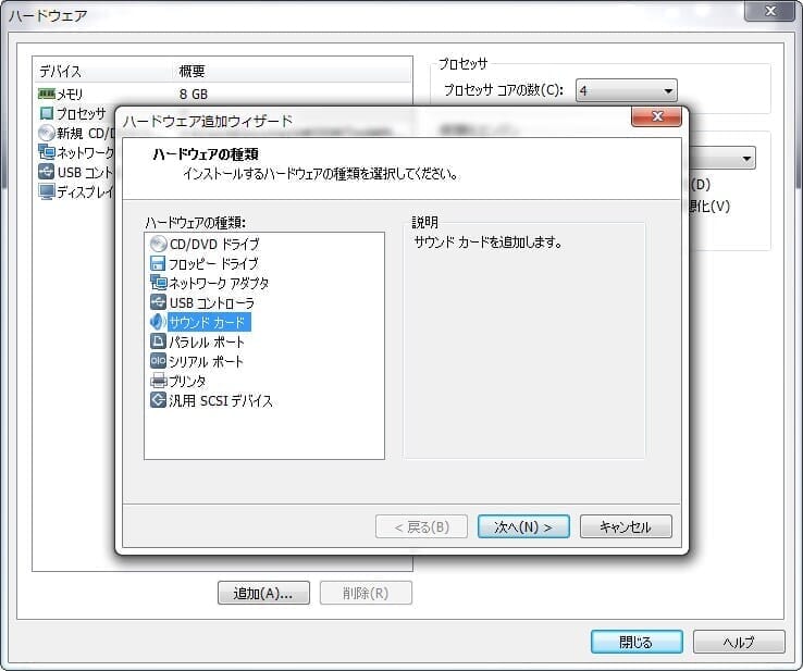 7)任意のメモリ容量・CPUコア数・サウンドカードを追加を設定
