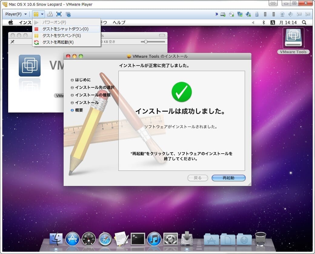 VMware Toolsをインストール後、再起動を求められるので、そのままシャットダウンします。