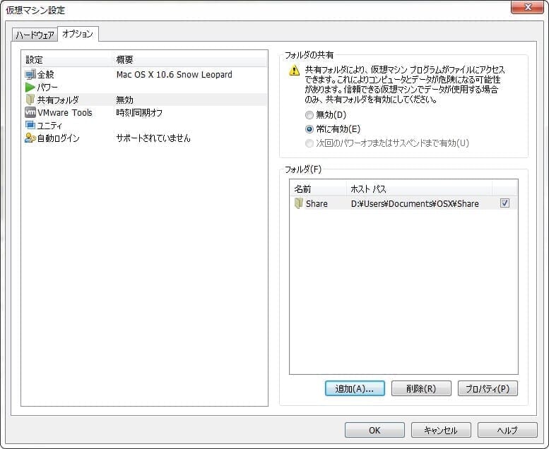 仮想マシンの設定→オプション→共有フォルダで追加します。