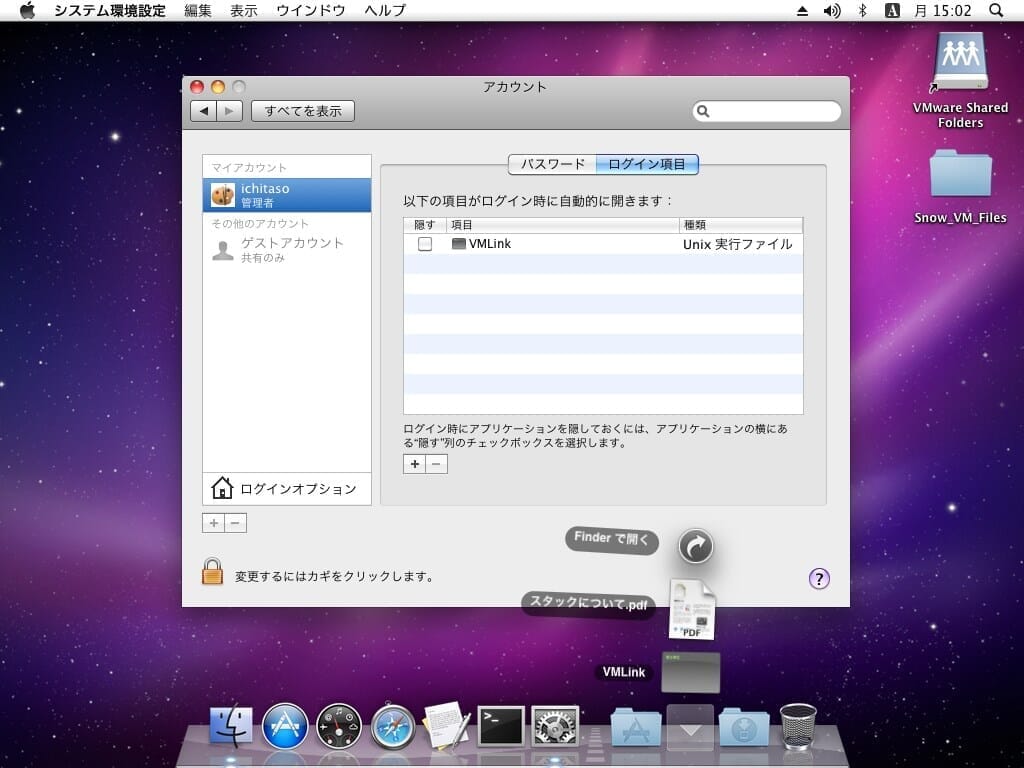 その前に、同梱している「VMLink」というファイル(上記で実行したコマンドを実行するファイル)を書類などに入れて、システム環境設定のログイン項目に追加しておきましょう。