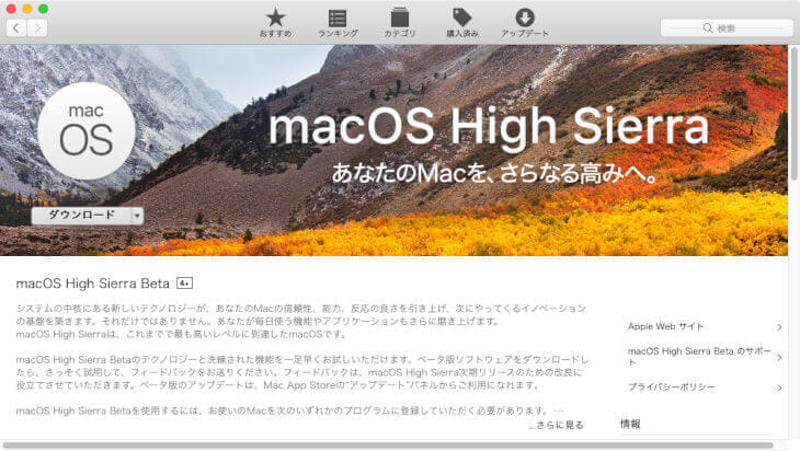2.Mac App Storeが開くので、macOS High Sierra Betaをダウンロード