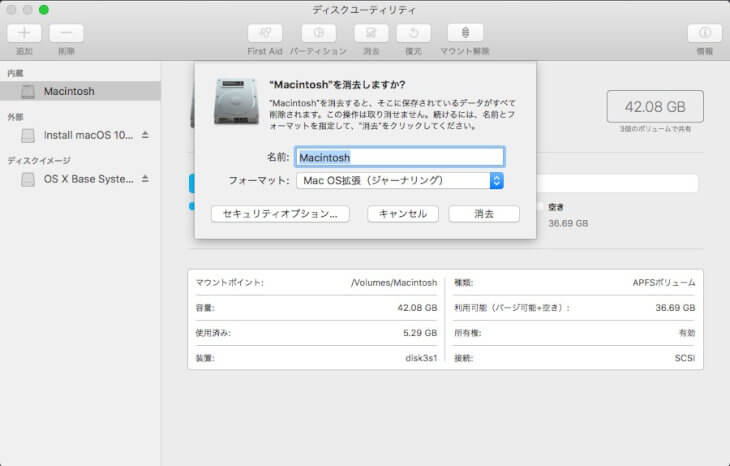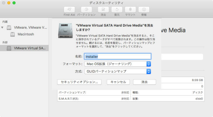 ※デフォルトでフォーマットが「APFS」になっていますが、VMwareが対応していないため「Mac OS 拡張(ジャーナリング)」にしてください。