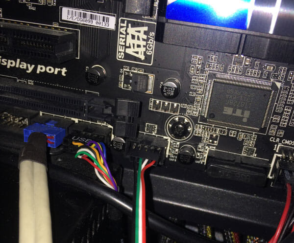 マザボへのUSB接続はピンがわかりづらいですが、下側の一番右が赤のケーブルになるように繋ぎます。