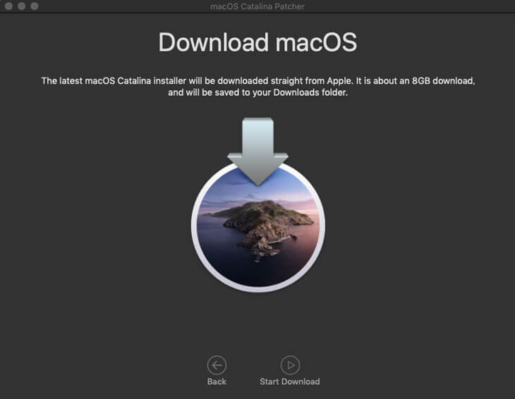 Mac App Storeからダウンロードすると、フルサイズのインストールイメージがダウンロードされないため「macOS Catalina Patcher」を利用します。