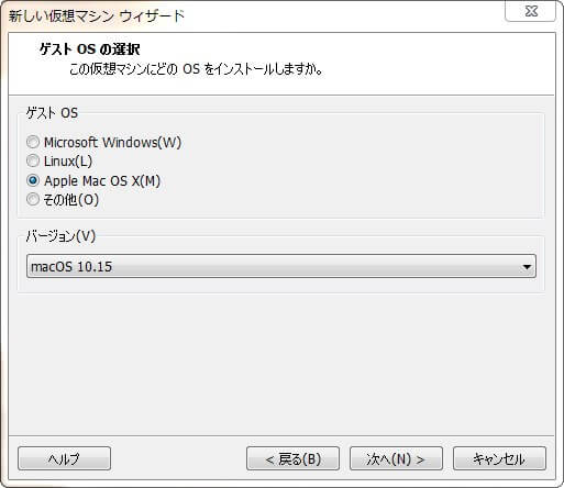 3)ゲスト OSを「Apple Mac OS X」の「macOS 10.15」にする