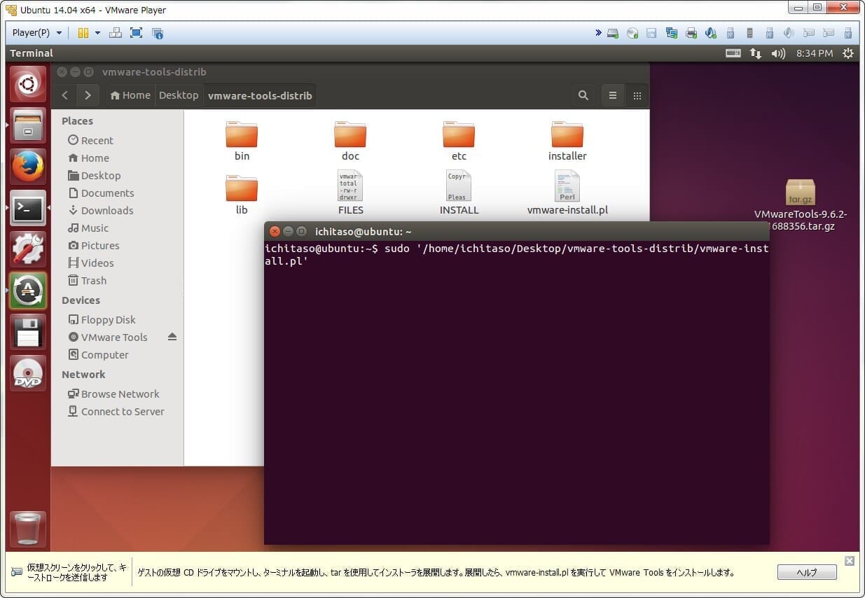 - VMwareの「Player」→「管理」→「VMware Toolsのインストール」デスクトップに「VMwareTools-xxx.tar.gz」を展開して「vmware-install.pl」を管理者権限で実行