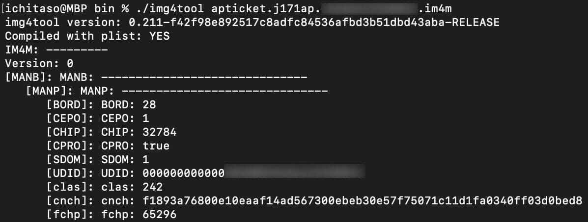 「img4tool」に、このim4mファイルを渡すと「nonce」を確認でき、cnchの値がnonceで`x8A4 -t`で得た値と同じになるはずです。