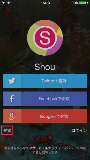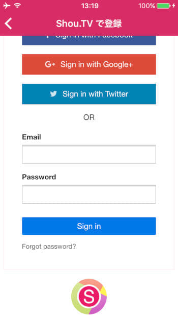 Shou(Shou.TV)を開くとTwitter、Facebook、Google+、メールアドレスいずれかで連携してアカウントを作成する画面になります。