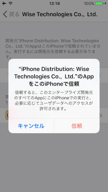 4.アラートが表示されるので、「信頼」をタップ