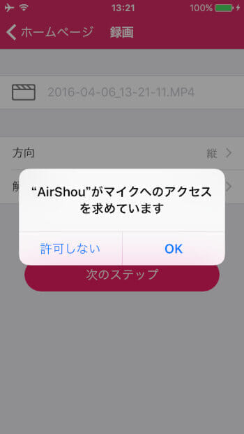 設定が終わり、次のステップをタップすると、マイクのアクセスを求められるので「OK」をタップ