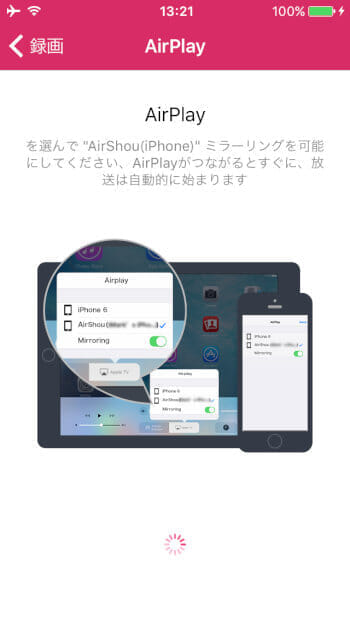 AirShou(デバイス名)を選択し、ミラーリングをONにすると録画が開始されます。