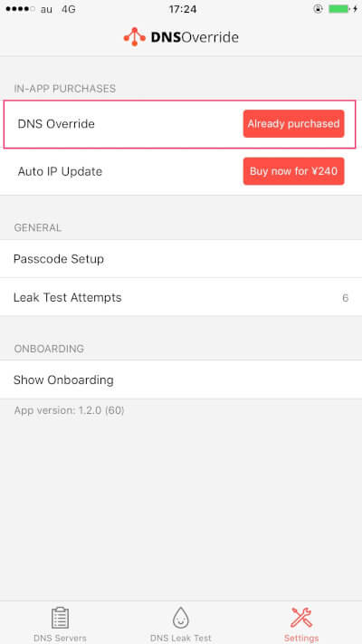 1.アプリ内にあるSettingsタブを開いて「DNS Override」のアプリ内課金を支払う