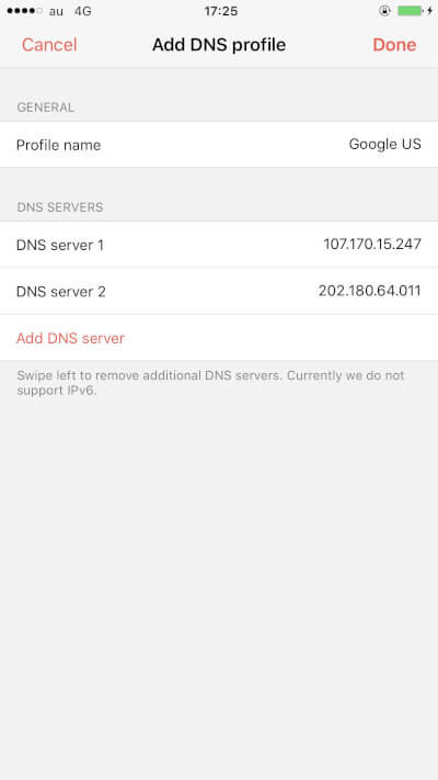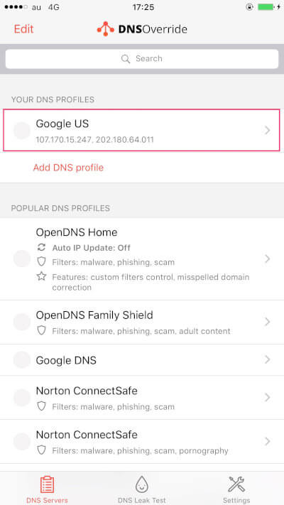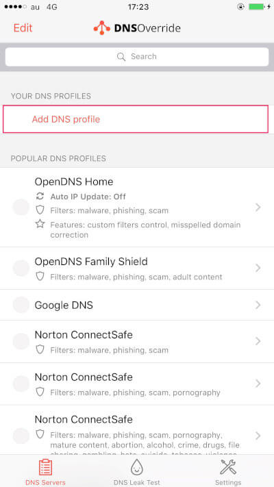 2.DNS Serversタブの「Add DNS profile」をタップし手動でDNSサーバーを追加