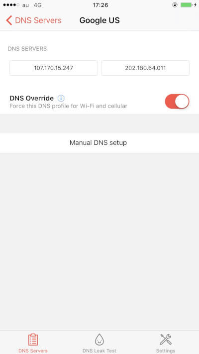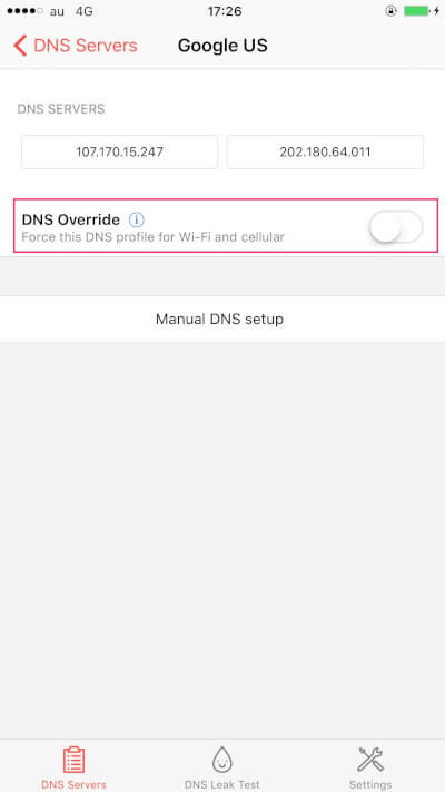「DNS Override」のスイッチがONの場合、USのDNSに接続されます。OFFにすると元の状態になります。