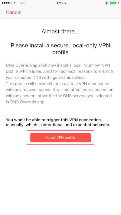 このVPNプロファイルを入れることでDNSをオーバーライドすることができるようになります。