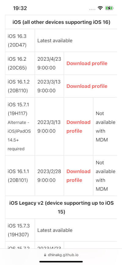 こちらのページから「iOS (all other devices supporting iOS 16)」にあるiOS 16.1.2のプロファイルをダウンロードしてインストールします。一番上は「iPhone 14 series」なので間違わないように注意してください。