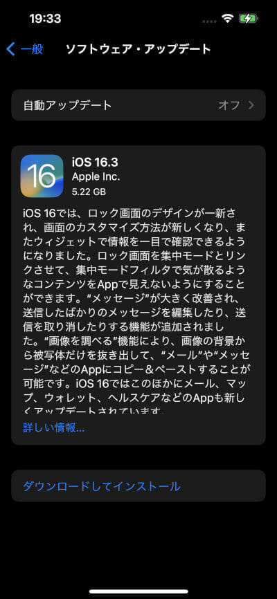 すぐには反映されなかったみたいで、iOS 16.3のアップデートが表示されました。そのため、一度設定アプリを完全に終了させて再起動したところ、無事iOS 16.1.2のインストールができるようになりました。
