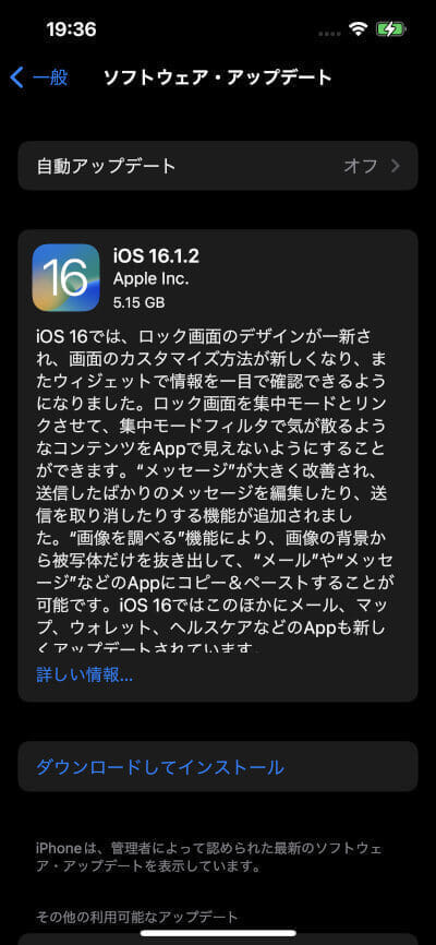 あとは「ダウンロードしてインストール」をタップして16.1.2へOTAアップデートするだけです。
