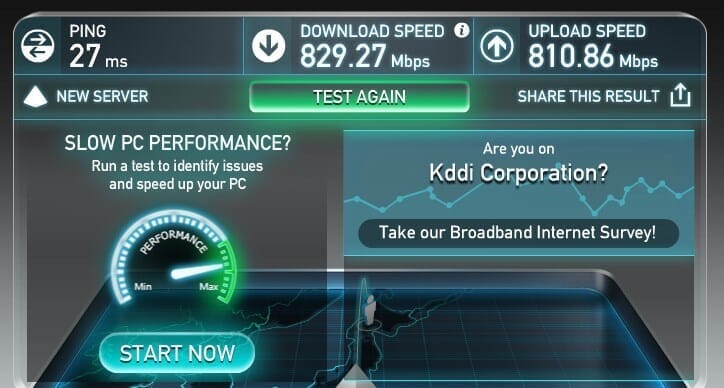 有線LAN接続したPCに比べると遅いですが、十分速くて使えます。