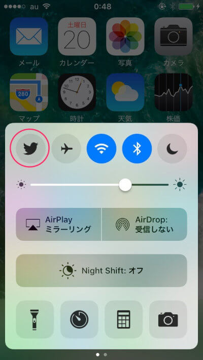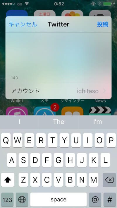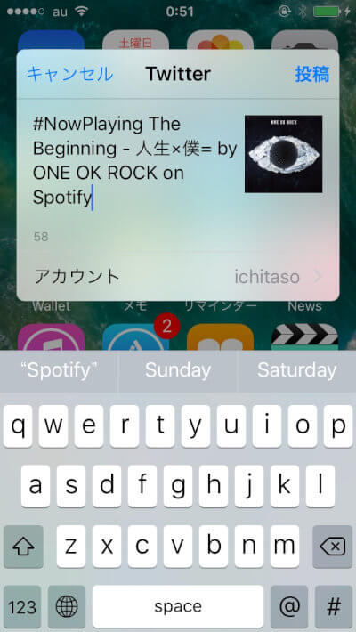 純正のミュージックアプリやSpotify、Pandoraなどから曲を再生している時にスイッチを押すとツイッターへのシェア画面になります。