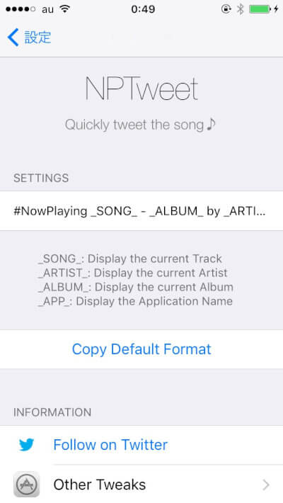 「Copy Default Format」をタップすると、デフォルトの文字列がコピーされます。設定をもとに戻したい時に使用して下さい。