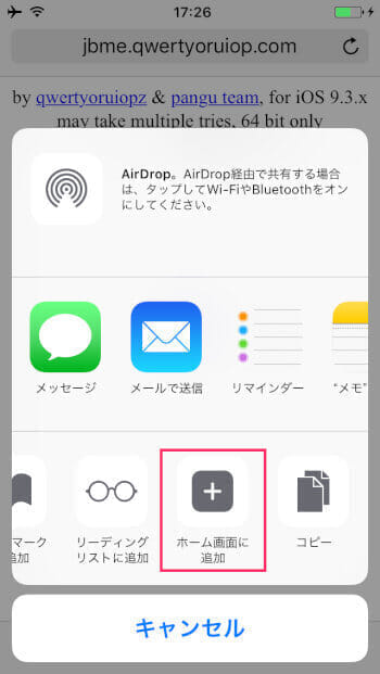 2.シェアメニューから「ホーム画面に追加」で、すぐにアクセスできるようにします。