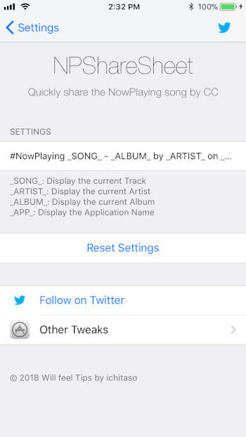 iOS 11 Electra Jailbreak環境で、現在聴いている曲の情報をコントロールセンターからTwitterなどにシェアできる「NPShareSheet」を作成しました。