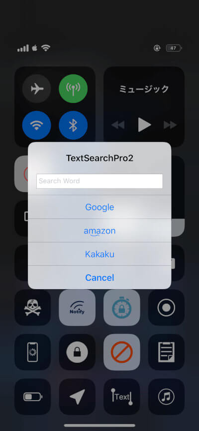 TextSearchPro2は選択メニューとコントロールセンター両方から実行することが可能です。外出先でサッと気になった商品を検索して、価格などをチェックするときなどにも便利です。