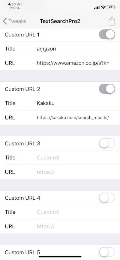 その他にカスタムURLを5つ設定することができます。アプリのURLスキームにも対応していて、開けない場合は設定画面を開きます。