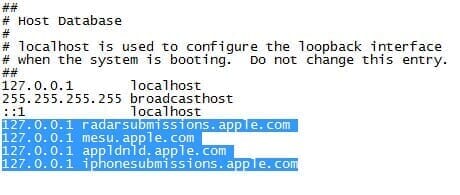 その後、/private/etcディレクトリに移動して「hosts」をダブルクリックし以下の部分を削除、上書き保存します。