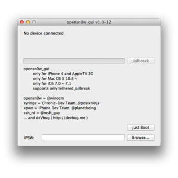 iOS 7.1beta2では、以前まで可能だったiPhone 4のopensn0wを使ったSSHによるtethered JBが簡単には出来なくなっていましたが、deVbugさんが色々と解析されて「opensn0w_gui」というGUIで行うJailbreakツールを作成されました。