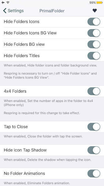 Hide Folders Icons:ホーム画面上のフォルダアイコン内のアイコンを消します。Respringが必要です。