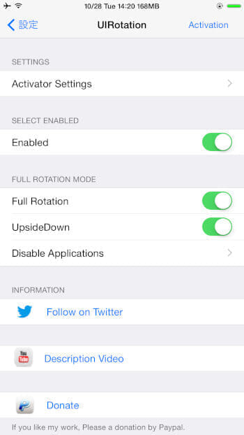iPhoneやiPadなどで画面の回転をロックさせていても、Activatorのジェスチャーによって任意の方向に画面を回転させる『UIRotation』のiOS 8対応版を作成しましたので紹介いたします。