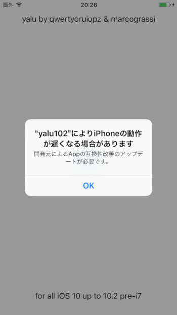 また、個人の署名でアプリをインストールしているため、一週間でyalu102が使えなくなります。その時は再度IPAファイルをCydia Impactorでインストールして上げる必要があります。
