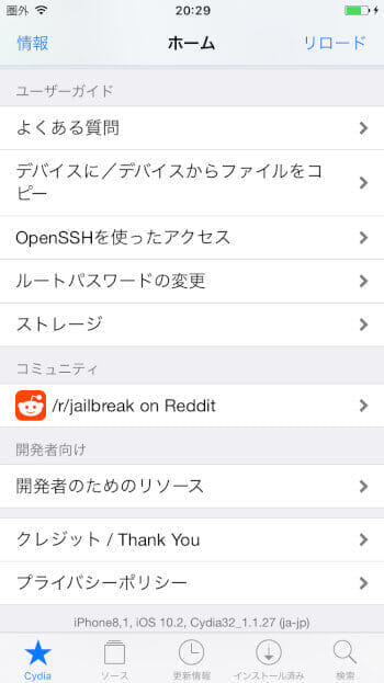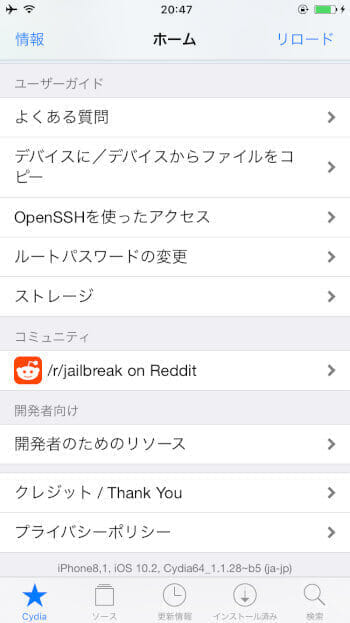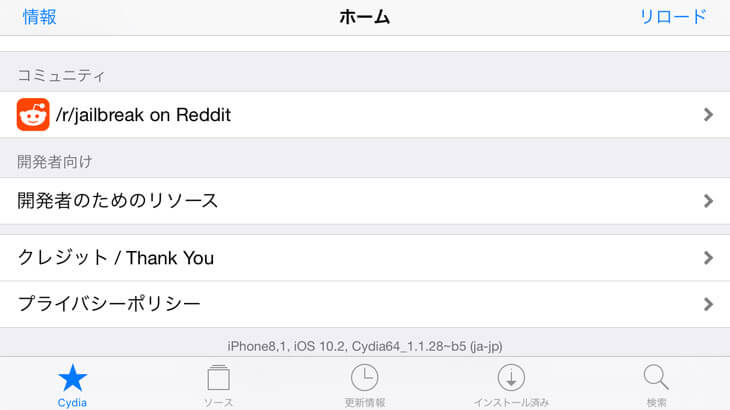 脱獄後、インストールされるのがCydia32_1.1.27(32bit)のため、Repositoryを更新してCydia64_1.1.28をインストールしてください。