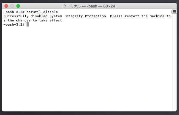 →「System Integrity Protection status: enabled.」と表示されたら有効になっています。