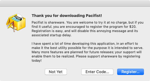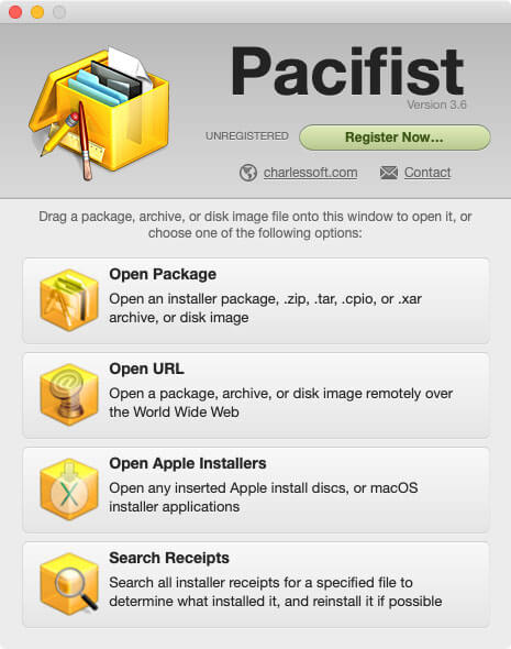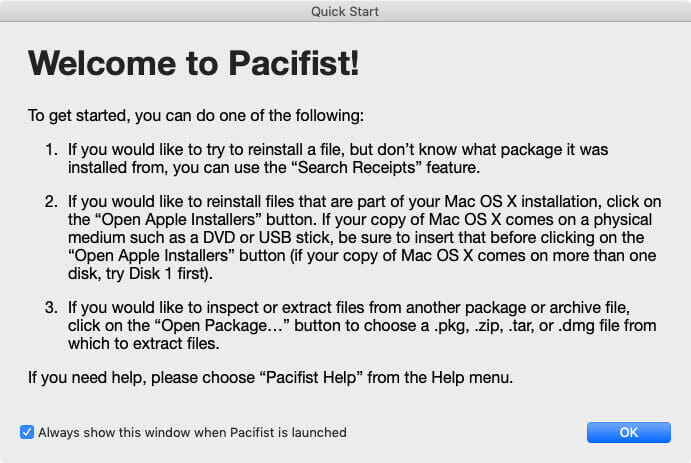 「Pacifist_3.6.zip」を展開すると「Pacifist.app」が出てくるのでアプリケーションフォルダにでも入れましょう。アプリを起動すると以下のような表示がされます。