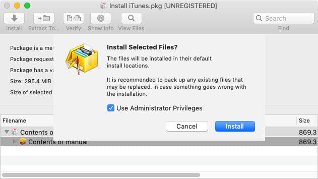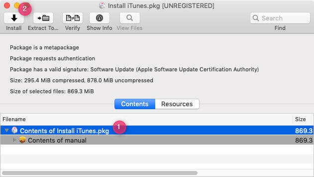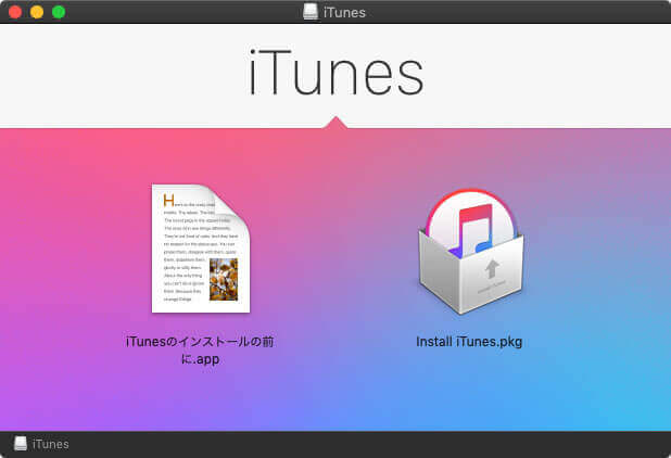 2)Contents of install iTunes.pkgをクリック→左上の「Install」をクリック