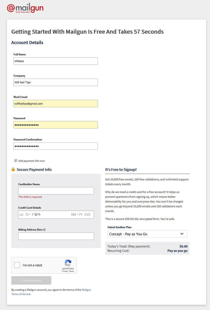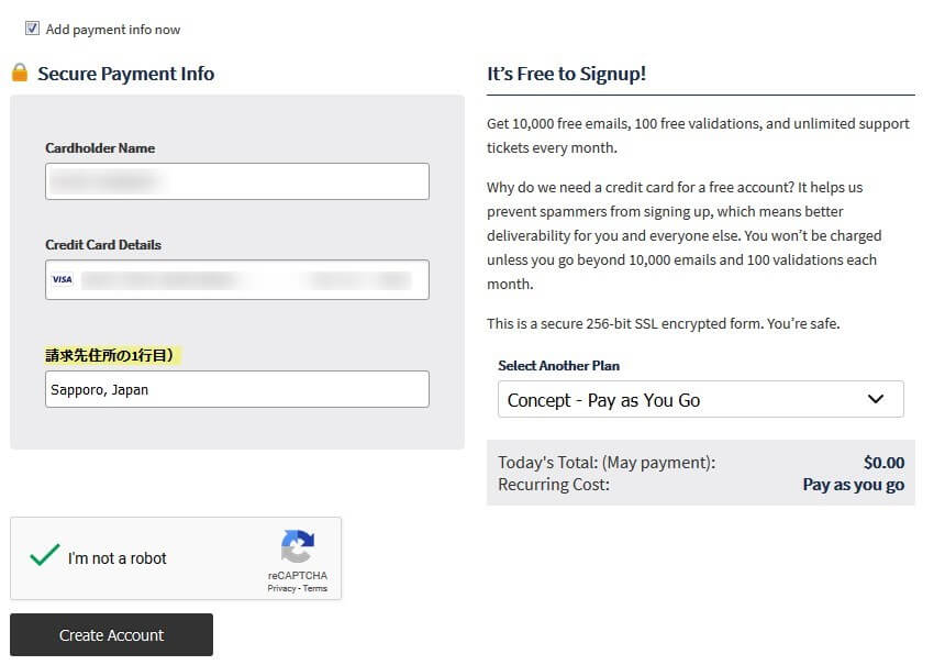 10,000通/月まで無料ですが、それ超えたときのためにクレジットカードもしくはデビットカードを登録します。個人の場合、月に10,000通もメールをすることがないので実質無料で利用できます。