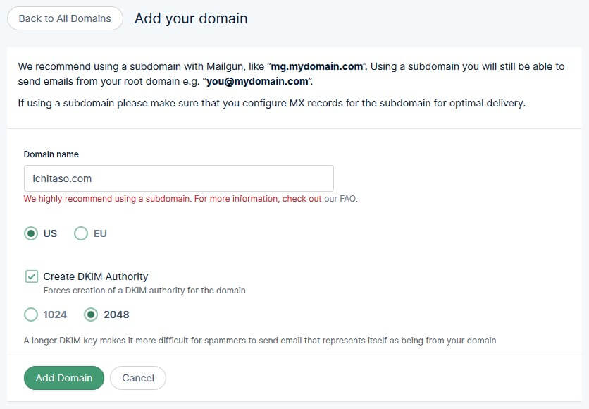 ドメインを入力して「Add Domain」をクリック