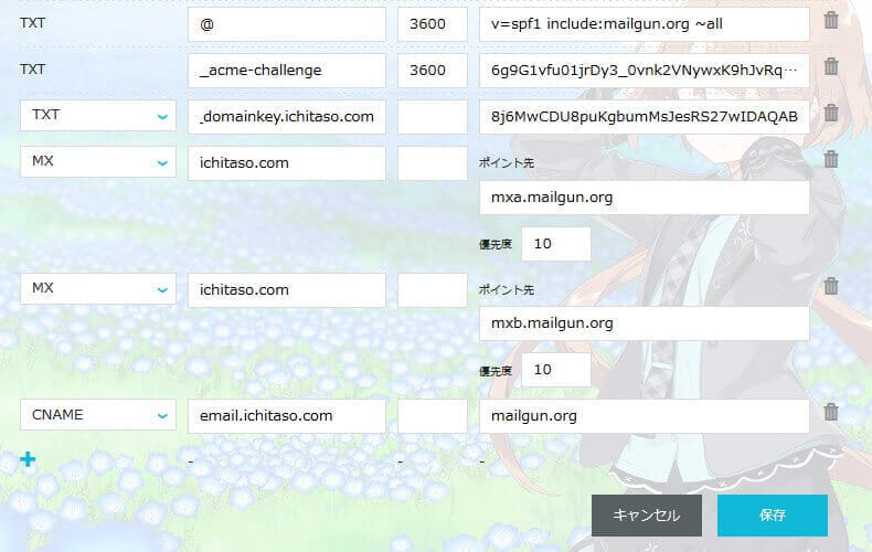 TXT、MX、CNAMEを入力して設定してください。